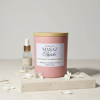 Świeca zapachowa Masaż Tajski 200 g | zapach białe kwiaty, piżmo i wanilia | 100% wosk z oliwek